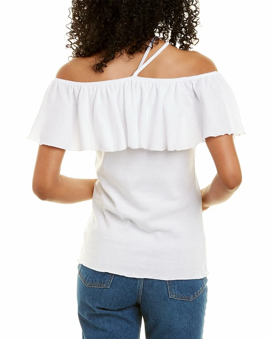 - Baby Rib Ruffle Top In White With Halter Neck, And Ruffled Off-The-Shoulder Neckline