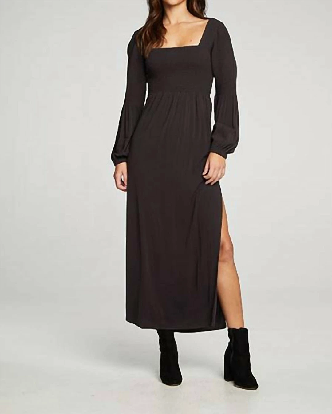 This blouson sleeve smocked square neck maxi features heirloom woven fabric and a long slit up the side.