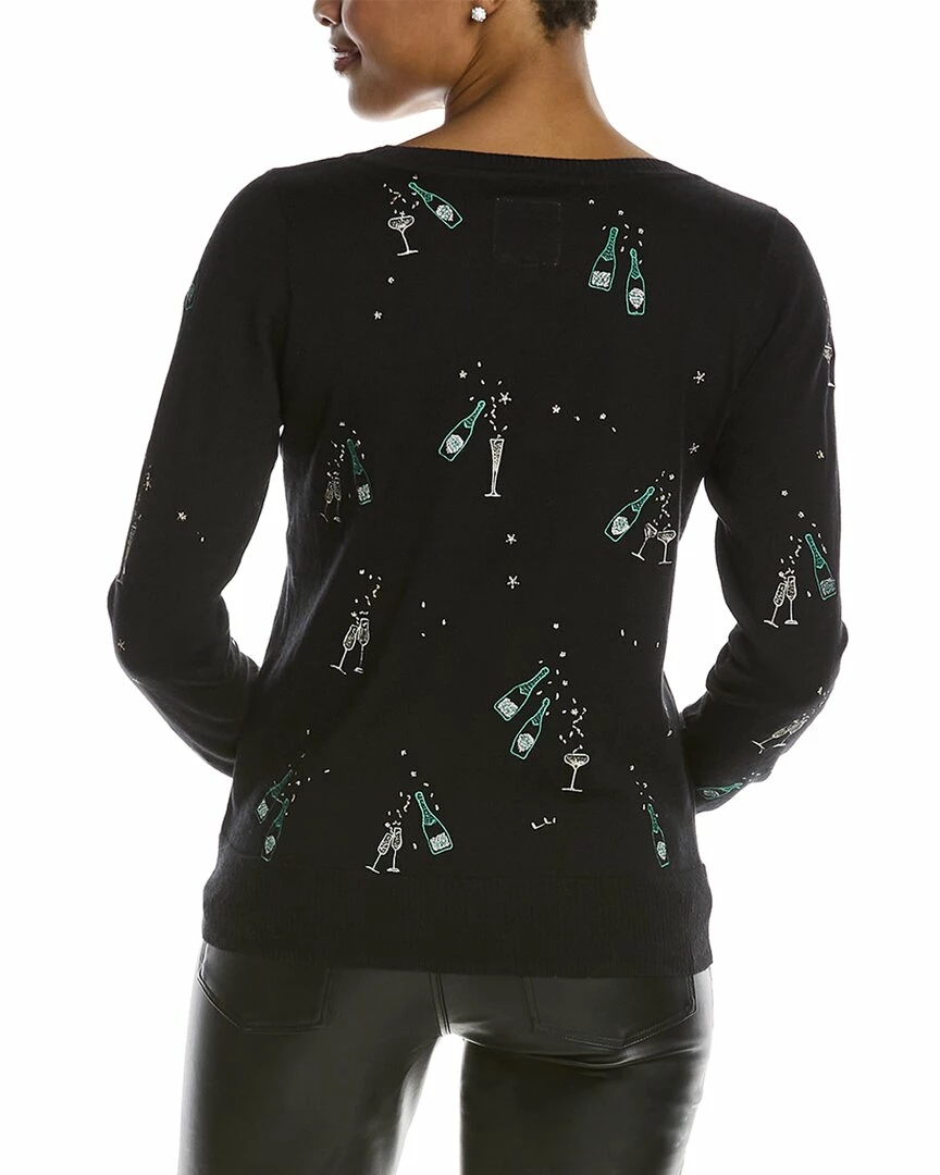 - Champagne Party Cashmere-Blend Pullover In True Black With Crewneck And Allover Graphic Print