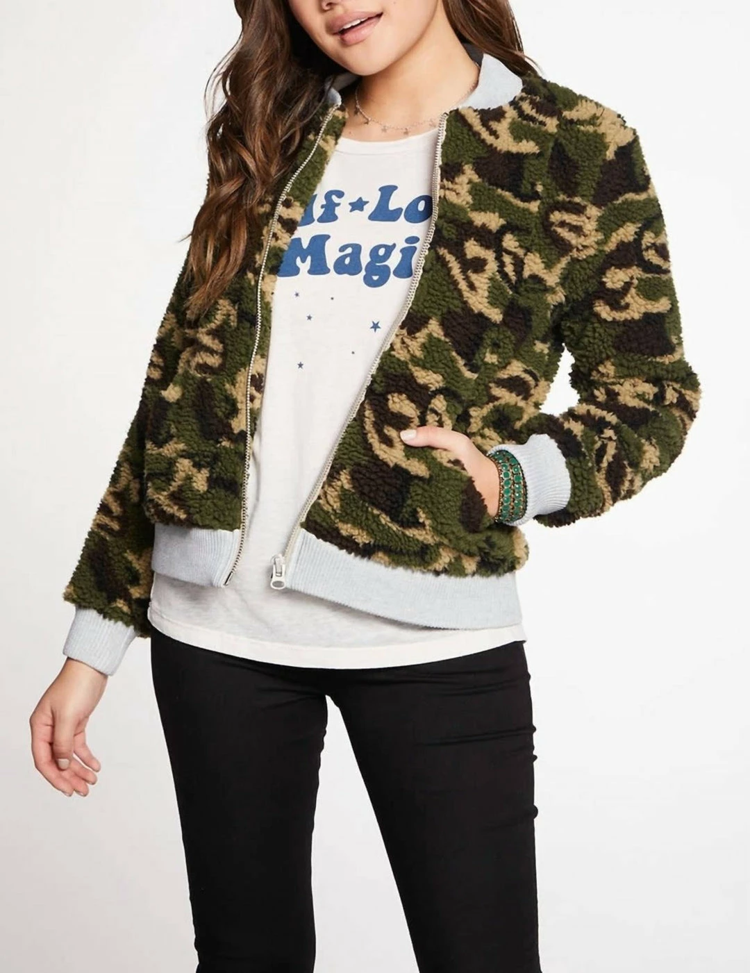 We Love It When Chaser Mixes It Up A Little And Throws In A Super Cute Trendy Piece! This Camouflage Bomber Jacket Is A Must For This Season. Pair It With Denim Or Joggers!