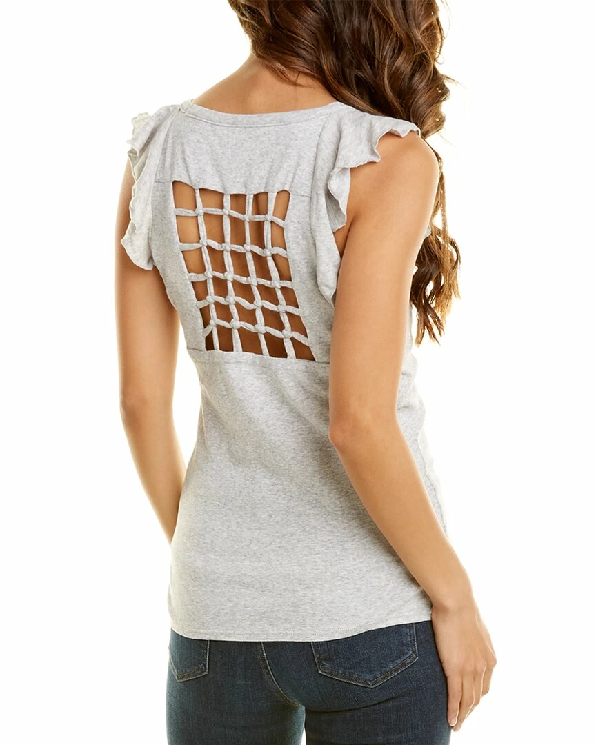 - Flounce Top In Heather Grey With Ruffled Sleeves, Raw Edge Trim, And Lattice Back