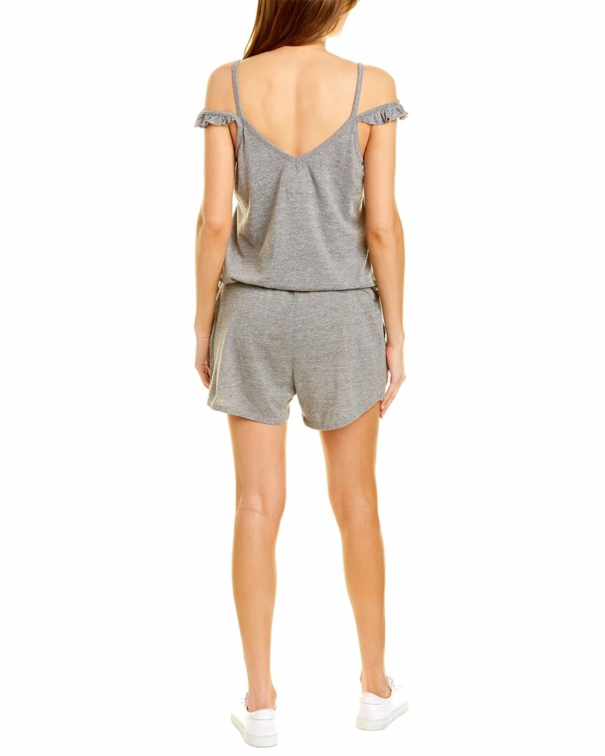 - Fluttery Romper In Streaky Grey With V-Neck, Ruffled Shoulders, Drawstring Waist, And Dual Front Angled Pockets