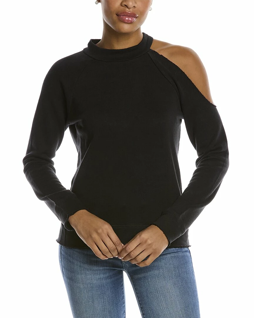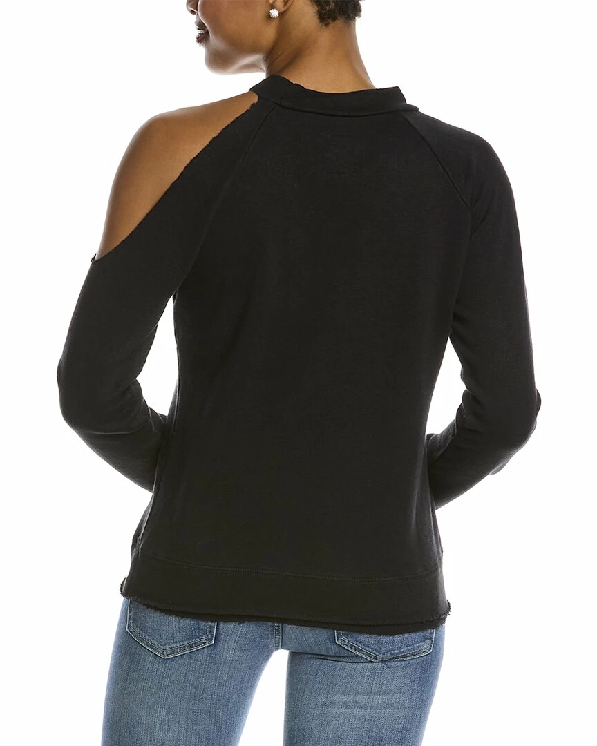 - French Terry Vented Shoulder Linen-Blend Pullover In True Black With Mock Neck, Raglan Sleeves With Cutout Left Shoulder And Furled Trim