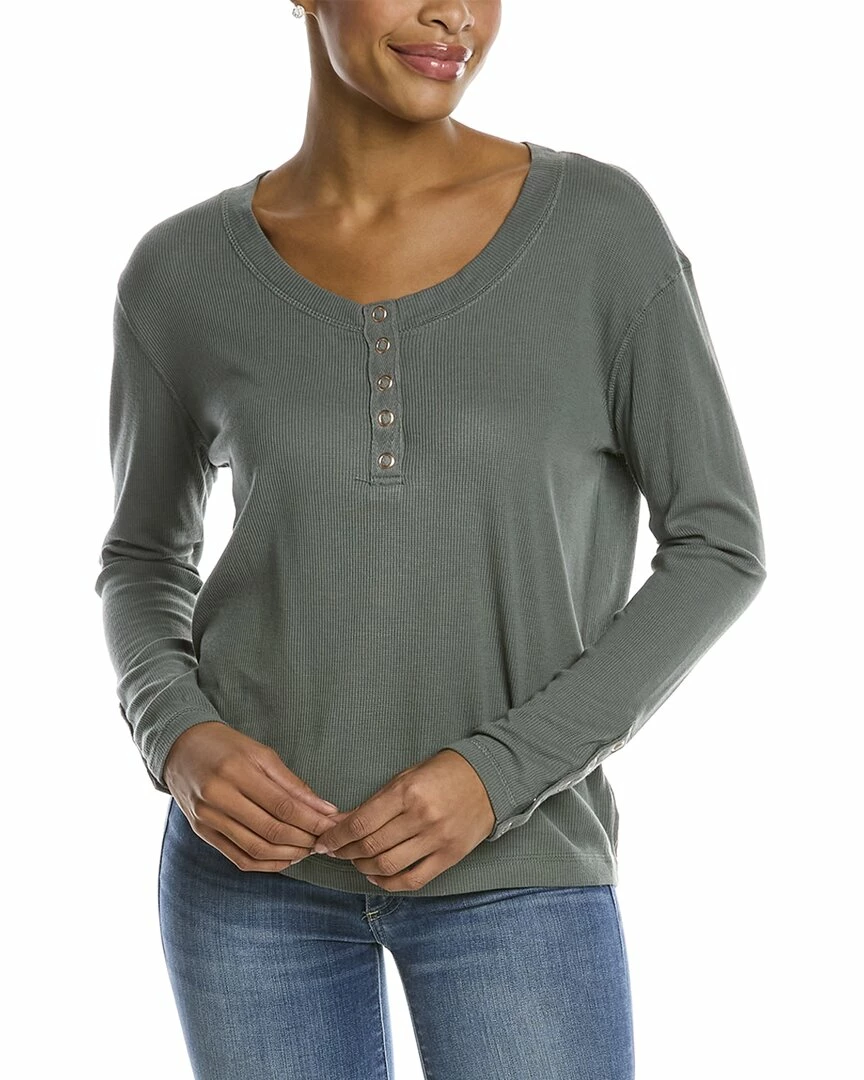- Heritage Waffle Henley In Green With Waffle Knit, Dropped-Shoulder Sleeves And Snap Accents