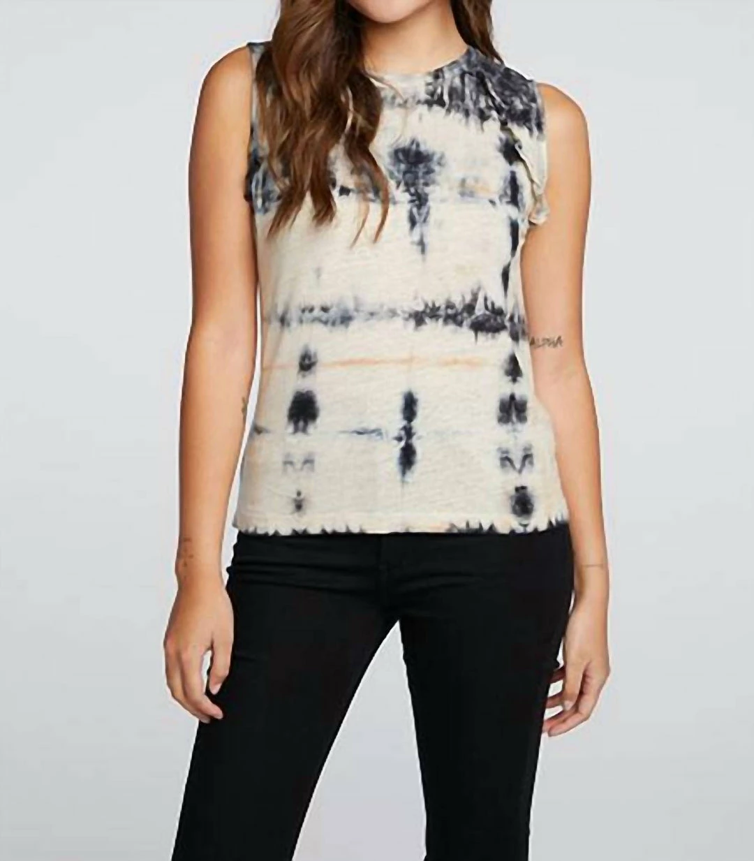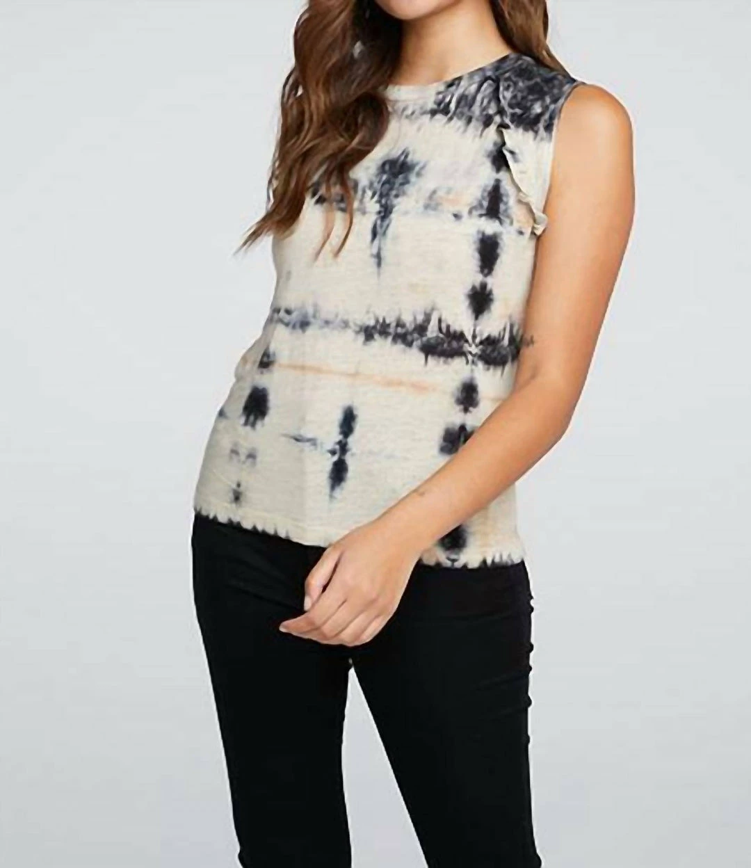 Linen Jersey Ruffle Raglan Muscle Tank features imported fabric and slight stretch. Pair with black bottoms for an easy, everyday aesthetic. Black tie-dye is always in season, so prepare for plenty of wear!