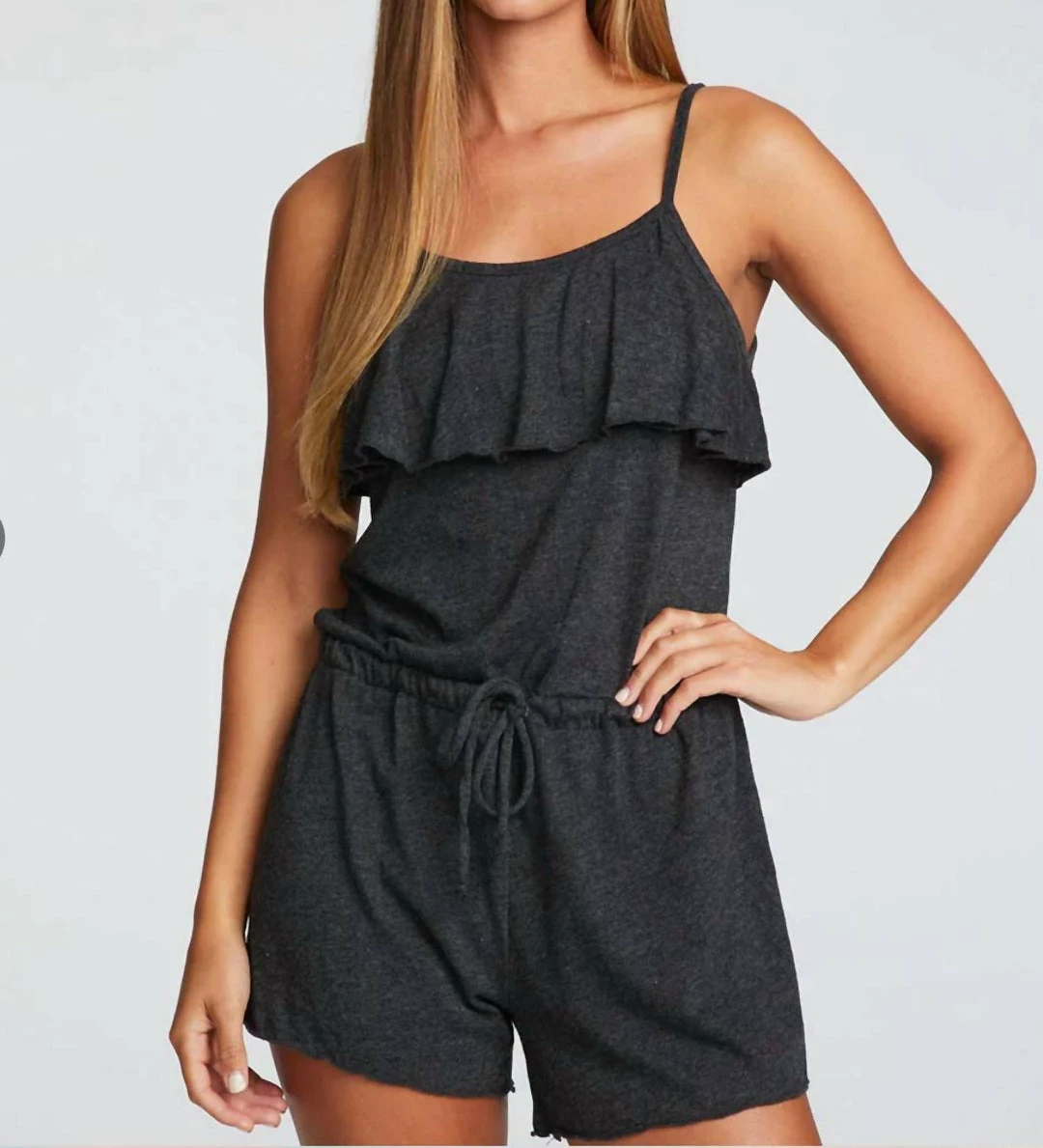 Our Triblend Jersey Ruffle Front Shorts Romper features imported fabric.
